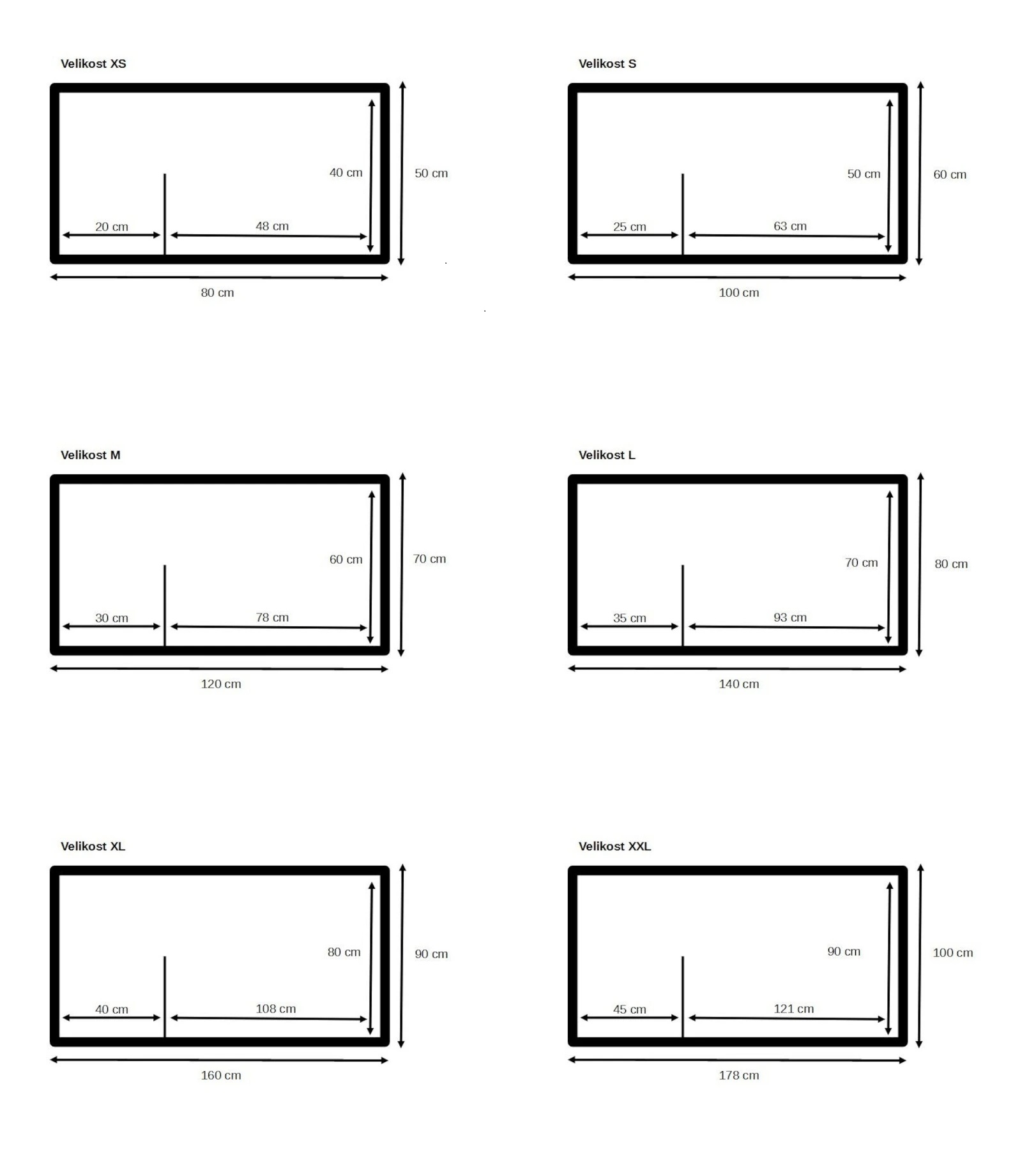 | XS | 80 × 50 cm | 29,5 × 17,5 cm | do výšky 30 cm |