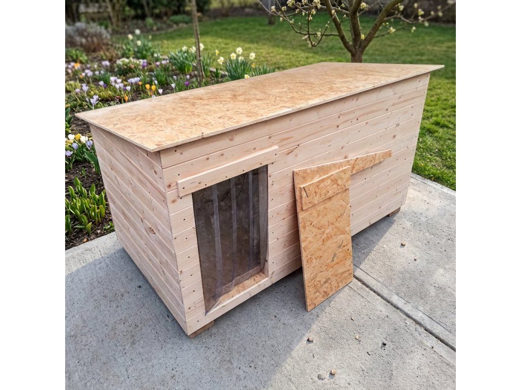 Vyrobena je z masivních dřevěných palubek a OSB desek – žádné tenké materiály, ale pevná a stabilní konstrukce, která drží tvar i po letech používání. Díky zateplení poskytuje psovi komfort v chladnějších měsících ❄️ a chrání ho před větrem i nepříznivým počasím 🌬️.